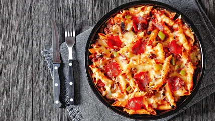 Antoinette Gangi says, "To incorporate more classic pizza toppings like pepperoni, sausage, olives and peppers into your casserole, mix some in with the pasta and layer the rest on top." For example, when making pepperoni and mushroom pizza pasta, build your tomato sauce around sautéed onions, mushrooms, and garlic. Then, add additional mushrooms to the top of your dish before baking.