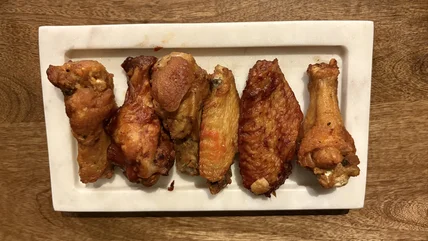 The appearance of these spicy wings alone reveals how hot they are. Smothered in an aromatic reddish-brown sauce and covered with pepper flakes, you can see and smell the heat emitting from these wings before you taste it. Once you do taste it, though, there's no turning back. Your mouth is met with a combination of many spicy flavors; hints of habanero, black pepper, and hot sauce join forces for an explosion in your mouth. Like Robert Oppenheimer in the 1940s, the person behind these extremely spicy wings seemingly threw a bunch of dangerous ingredients together until they got a reaction.