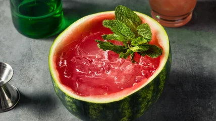 Once your watermelon has been hollowed out, that's when things can actually get interesting ... because what are you putting in it? The options are endless. Perhaps you'd like to keep it breezy with a watermelon shandy, which is fizzy and fruity and perfect for anyone who thinks they aren't much of a beer person but still keeps the beer people happy too. Or if you're looking for something a little stronger, mix watermelon juice with tequila for a watermelon paloma cocktail. In this gorgeous drink, the melon's sweetness will work to smooth out the tequila's bite, making it almost dangerously smooth to drink. And if you want to be even fancier, toss in fresh mint or basil for a refreshing, herby twist, just give them a light muddle first (nobody wants a whole leaf floating in their drink). Keep some ice at the ready next to your watermelon keg so people can add it to their own glasses when they pour, that way the keg's contents won't get watered down over time.