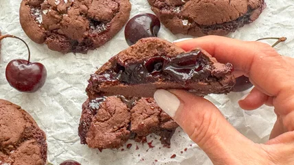 If you've ever had a chocolate-covered cherry, then you know the magic that happens when you pair velvety rich chocolate and tangy sweet cherries. It's a timeless combination that is so simple yet so decadent. This cocoa-packed cookie is sweet and chewy and gives way to a deliciously juicy and unexpected jammy center that's perfect with the deep fudgy chocolate. The sprinkle of flaky salt brings the whole combination to life. There's a delightful element of surprise that a standard thumbprint cookie just doesn't deliver. This elevated twist is deceptively easy to make and even leaves you with some leftover cherry jam to enjoy in other ways.