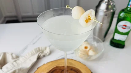- Thread the 2 lychees with a cocktail pick for garnishing. Serve the martini.