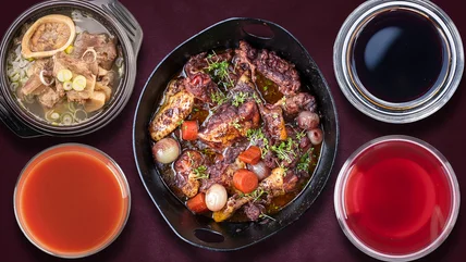 For many of the same reasons that grape juice works, pomegranate juice will work as well. "Pomegranate juice is one of my favorite swaps because it has a deep, fruity flavor and a natural tartness that mimics some of the qualities of red wine," Julia Chebotar says. "It works especially well in slow-cooked meats and hearty vegetable dishes." Bonus tip: Reduce the pomegranate juice a bit before adding it to your dish. This concentrates the flavors, thickens the liquid slightly, and results in a richer, more luxurious product that is closer to red wine in body.