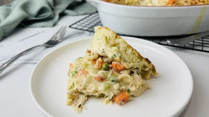 If you're looking for a true weeknight winner, this cheesy, creamy chicken cobbler delivers comfort and convenience with every bite. It combines tender rotisserie chicken with a mix of veggies and fresh herbs, all coated in a rich, creamy sauce for a soul-satisfying, one-dish meal. The crowning touch is a golden, cheesy buttermilk biscuit topping that bakes up fluffy and tender — perfect for soaking up every drop of the luscious filling.
