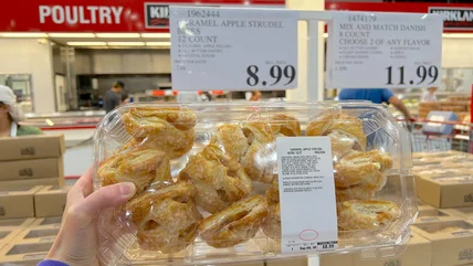 One of its newer releases, which may soon vie for top billing on any ranking of Costco pastries, is its Caramel Apple Strudel Bites. Unlike traditional apple strudel, which is usually assembled into one long roll that is baked and cut into serving slices, this variety is formed into individual servings that are roughly 2 1/2 inches x 2 1/2 inches in size. They are available from participating Costco warehouses nationwide. Each plastic box contains 12 pieces and retails for $8.99 per package, though prices may vary by location.
