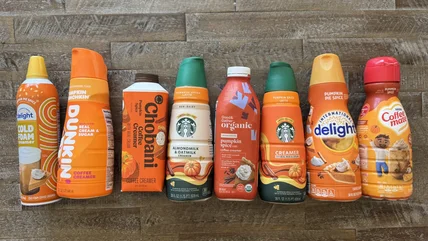 I've had my fair share of bad pumpkin creamers over the years — ones that taste watery, or sickeningly sweet, or decidedly not like pumpkin — so I was excited to see what several popular coffee creamers could make of this seasonal icon. To do so, I rounded up all of the pumpkin creamers that I could find, poured 2 tablespoons of each creamer into an 8-ounce cup of home-brewed cold brew (tasted cold, straight from the fridge sans ice), and sipped. After I had tasted all the brands, I ranked them from worst to best, based on the balance of sweetness, use of spices and pumpkin flavor, and overall enjoyability. My top pick may even replace your go-to fast food pumpkin coffee.