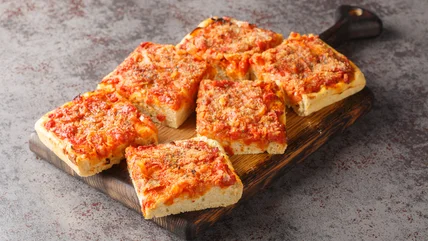 If you're wondering what makes Sicilian pizza different from Neapolitan, the most obvious distinction is its shape. Sicilian-style pizza isn't round; it mirrors the shape of the pan it's baked in, so it's usually served in rectangular slices. This focaccia-style pan pizza made its debut in 19th century Sicily, where, at the time, it was more commonly known as "sfincione" (meaning "thick sponge"). The name was a tribute to its doughy, soft, beautifully airy texture. It often came topped with a rich onion-based sauce, chopped anchovies, and caciocavallo, a cheese that falls somewhere between aged mozzarella and fresh provolone. Recipes changed once Sicilian immigrants in the United States began experimenting with toppings to adapt the pizza to what was locally available.