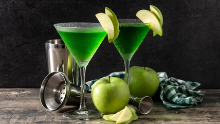 To make the appletini itself, pack a cocktail shaker with ice then add a couple of ounces of vodka and about an ounce and a half each of the liqueur and lemon juice. Shake until very cold and strain into the glasses, careful not to disrupt the rims. This would also be a great way to serve caramel apple wedges to take an appletini's seasonal garnish even further.