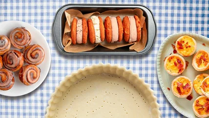 We recommend using a knife to gently wedge out your mini quiches once they're done baking. Greasing the tin beforehand will ensure that your lil' quiches pop right out without breaking.
