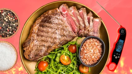 Most chefs find that medium-high to high heat is ideal for creating that delicious caramelized crust while maintaining control over the interior doneness. The thickness of the steak for a medium-rare is typically around 130 to 135 degrees F. To ensure optimal results, you should pull your steak off the heat when it is 5 to 10 degrees below your target temperature to allow for carryover cooking during the resting period. Carryover cooking is the residual heat that continues to cook the meat after it's been removed from the heat source. Heat from the hotter exterior of the steak can transfer to the cooler center, which can raise the internal temperature by several degrees. So, unless you want your medium-rare to turn into well-done steak, then it's important to keep in mind carryover cooking.