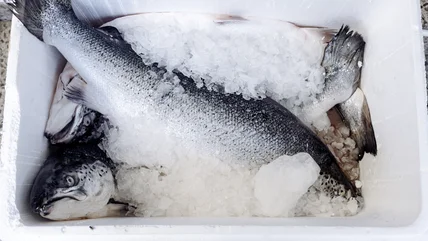 You probably know that you shouldn't leave seafood sitting out, but NOAA recommends that you keep it cold from the second you buy it at the store. Bring a cooler bag to place your seafood in after you check out so it stays the freshest. Just be careful about the cooler storage mistake that makes it way less effective. And if you've caught your own fish, it should immediately be put on ice. NOAA also recommends using an ice slush with two parts ice to one part water. When you've gotten your seafood home, you should immediately put it in the coldest part of your fridge, with the ideal temperature being around 32 degrees Fahrenheit. For fresh fish that's not packaged, you should take a few extra steps. Put whole dressed fish on ice in the fridge, and seal filets or steaks in containers or plastic bags, then cover them with ice in a pan.