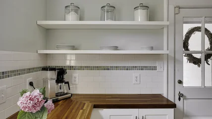 A cigar box, a lidded leather cube, and a crystal vase. These aren't the components of an escape room, but just a few of the unexpected vessels that you can repurpose in clever ways as storage containers for your kitchen's open shelves. The cigar box might just be the best fit for your flatware, and you can usually pick one up without even making a trip to the smoke shop. The cube can hide any wires you might want out of sight when you aren't using your throwback countertop TV or the more modern tablet take. And the vase is just the thing to hold your cloth napkin collection. Being that some of these elements can be serendipitously thrifted, they can also bring budget-friendly luxury to your open shelves.