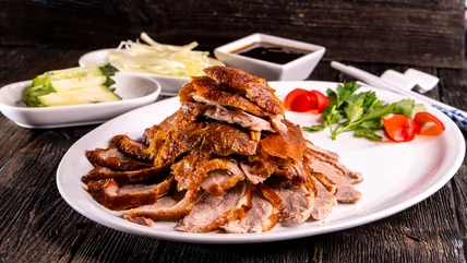 Peking duck has a long history, reportedly first appearing during the 13th century. It was first cooked in Hangzhou, a city near Shanghai, and only after the capital moved to Beijing in the 15th century did the recipe become associated with the city. Peking duck is cooked using a hanging oven method, where the birds are hung inside an oven for about an hour or until they're fully roasted.