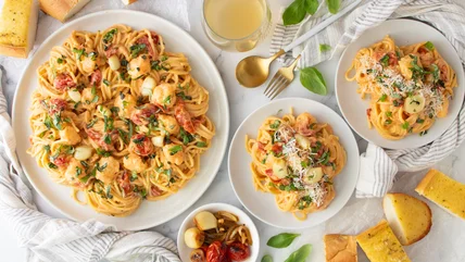 TJ's lobster bisque creates a luxe finish for our pasta sauce that also includes roasted garlic and oven-broiled tomatoes for a very special 30-minute meal.