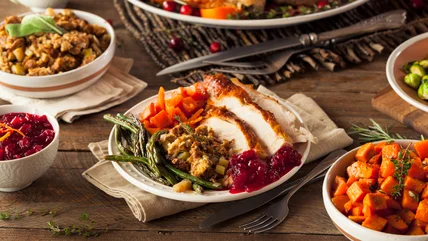 A Howard Johnson's advertisement from the 1960s featured its Thanksgiving dinner. The incredible spread included a starter of chilled fruit cup with sherbet or fruit juice, followed by celery and olives, and cream of celery soup. Turkey, the default main course for Thanksgiving, was accompanied by a huge array of sides, including gravy and Cape Cod cranberry sauce, mashed potatoes, glazed sweet potatoes, various vegetables, buttered rolls, and Waldorf salad. To finish, the restaurant served more sherbet, plum pudding, and pie. All of this cost $2.25, which today would be about $24.63 (assuming the ad was from 1960) due to inflation.