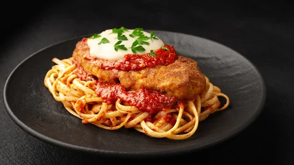 A classic chicken Milanese has some similarities to chicken Parm in that the chicken is pounded thin, breaded, and fried. However, it's often served with just a squeeze of lemon juice and light sides, such as an arugula salad. Brio goes more of the chicken Parm route by crusting the chicken with Romano cheese, topping it with mozzarella, and serving it on a bed of herb pasta and house-made marinara sauce. In fact, many would argue that it's actually an authentic chicken Parm.