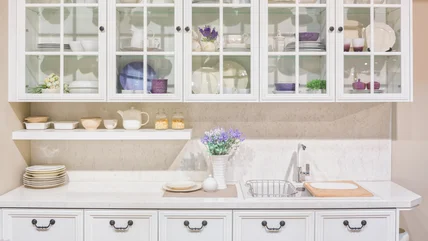 Glass cabinet doors aren't just nostalgic; they're also a great way of customizing your space. The glass panes give your kitchen a sense of space that can make small kitchens appear bigger than they actually are, and they make for a great built-in display case for unique dinnerware and fine china. Plus, there are many ways to make these cabinets your own. From the specific style of glass to interior finishing touches, they can be customized to suit even the most eclectic style. Not sure how to make this idea pop in your kitchen? Here are a few ideas.