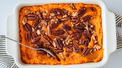 Now, the topping here is where this casserole really separates itself from more traditional versions. Instead of marshmallows, it's finished with a nut-based crust. On the official Ruth's Chris website, the recipe simply calls for chopped nuts, with no specific type required. This makes sense, as any nut will add crunch and keep the dish from feeling too soft all the way through. But, the website does note that pecans are preferred for the recipe, which makes sense, too: Pecans, particularly oven-roasted pecans, elevate the casserole by bringing a buttery richness that balances out the sweet potato base.
