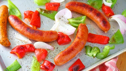Make this simple sheet pan meal by tossing your frozen onions and peppers in a bowl with olive oil. You can use the sausage links as is or chop them into smaller pieces. Line a baking sheet with parchment paper for an easy after-dinner clean-up, and add the sausage, peppers, and onions. Season with salt and pepper and some Italian seasoning, then bake it in the oven. However, that's not the only way you can make sheet pan sausage and peppers. You can spruce up this simple dinner with other additions, try different seasonings, and even swap out the ingredients.