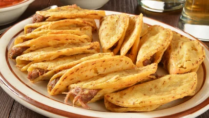 You can either make birria consomé yourself provided you have a few hours to let the flavors meld, or pick some up from the store. For $7.99, you can even grab Trader Joe's beef birria, though this comes along with a hefty serving of meat. To serve, simply heat up your tacos and birria, and serve as a dipping sauce. You can also pre-dip your cooked mini beef tacos into the sauce to serve them soaked with flavor. For best results, pop the saucy tacos back into the air fryer for a few minutes to help them crisp back up. Add shredded mozzarella for an extra cheesy twist.