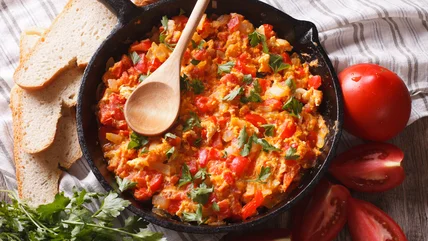 If you often find yourself reaching for a bottle of hot sauce to spice up to your scrambled eggs, you may want to give Nigerian egg stew a try. This vibrant dish features eggs scrambled in a spicy mix of tomatoes, onions, garlic, red bell peppers, and chiles such as habaneros or Scotch bonnets. It also includes seasonings such as thyme, bouillon powder, curry powder, and salt.