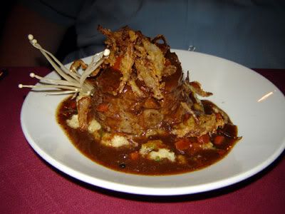 J.’s Boneless Braised Short Ribs were a masterpiece. A huge portion of the meat was resting atop a dollop of Jalapeno Mashed potatoes and a touch of J.’s fork had the meat melting. There was no need for a knife. Simply touch, stab and eat. J. raved about the dish, particularly how well the meat had been treated. The braising broke the meat down and the juices were fantastic. Each bite was an event worth savoring. J. noted how well the crisp onions and the sauce were the perfect counterparts to the meat. He also loved the mashed potatoes with just a bit of heat from the peppers and the luscious sauce that had drained down from the meat onto them. The entire dish was wonderful and I loved it as well.