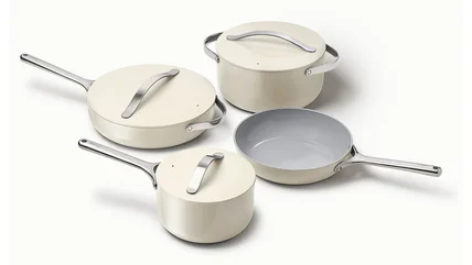 Each piece's nonstick ceramic coating over an aluminum base will better help those eggs slide around the pan, and it will enable you to use a little less oil in some cases. Caraway's cookware is also free from PFOA, PTFE (better known as Teflon), and some of the other chemicals you're likely trying to avoid. And every item transfers easily from the stovetop into the oven at temperatures up to 550 degrees Fahrenheit so you can get a good sear and the ideal finish on those steaks and salmon fillets.
